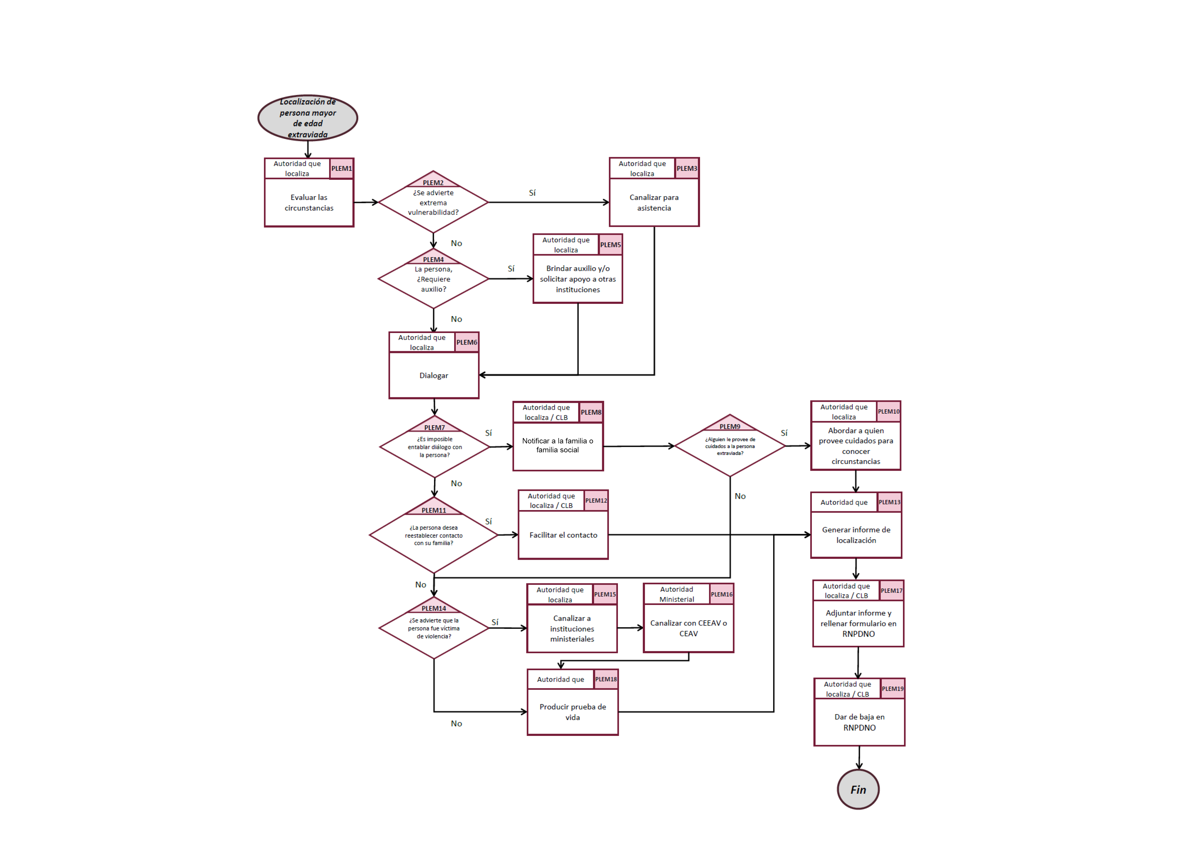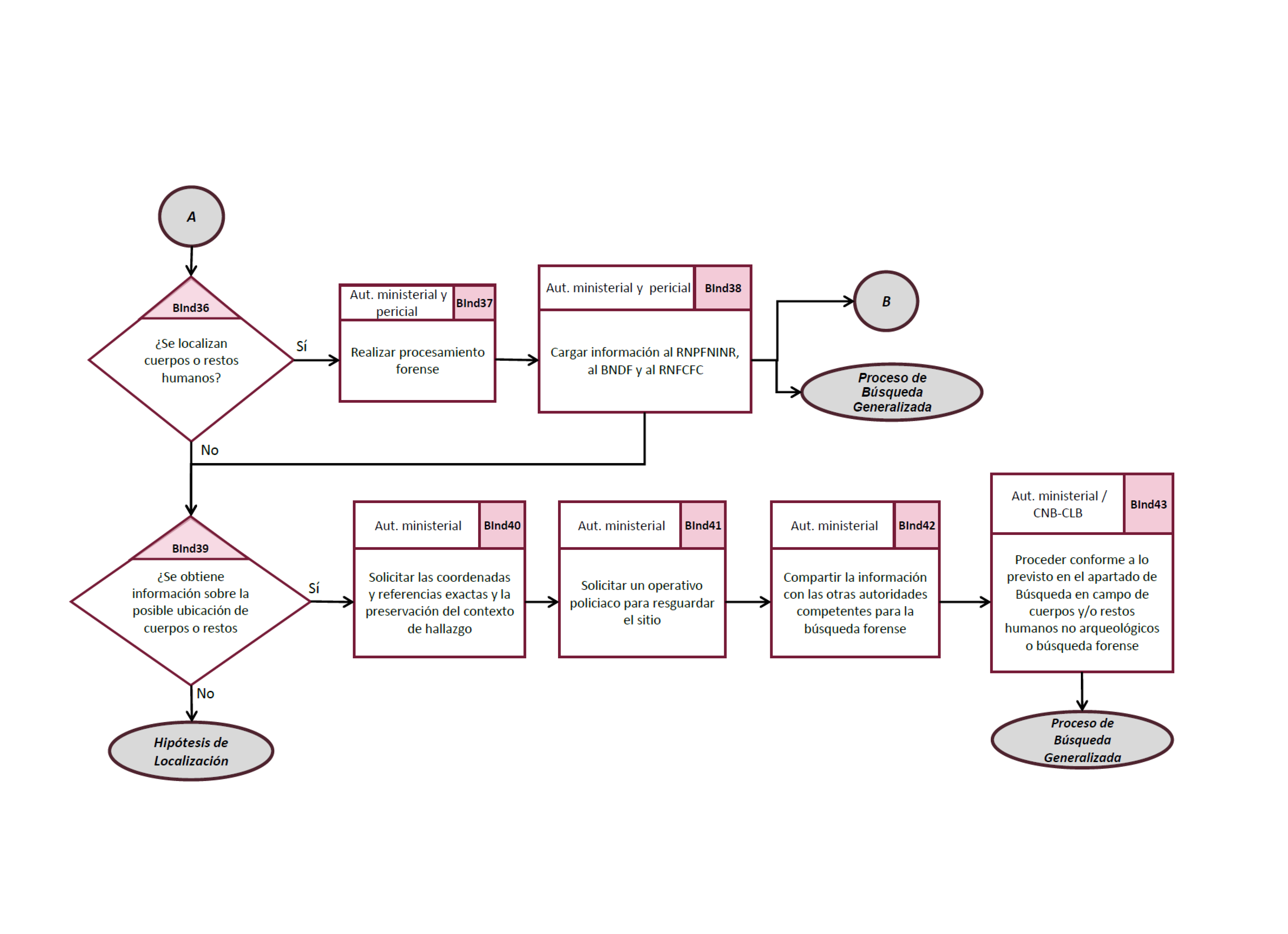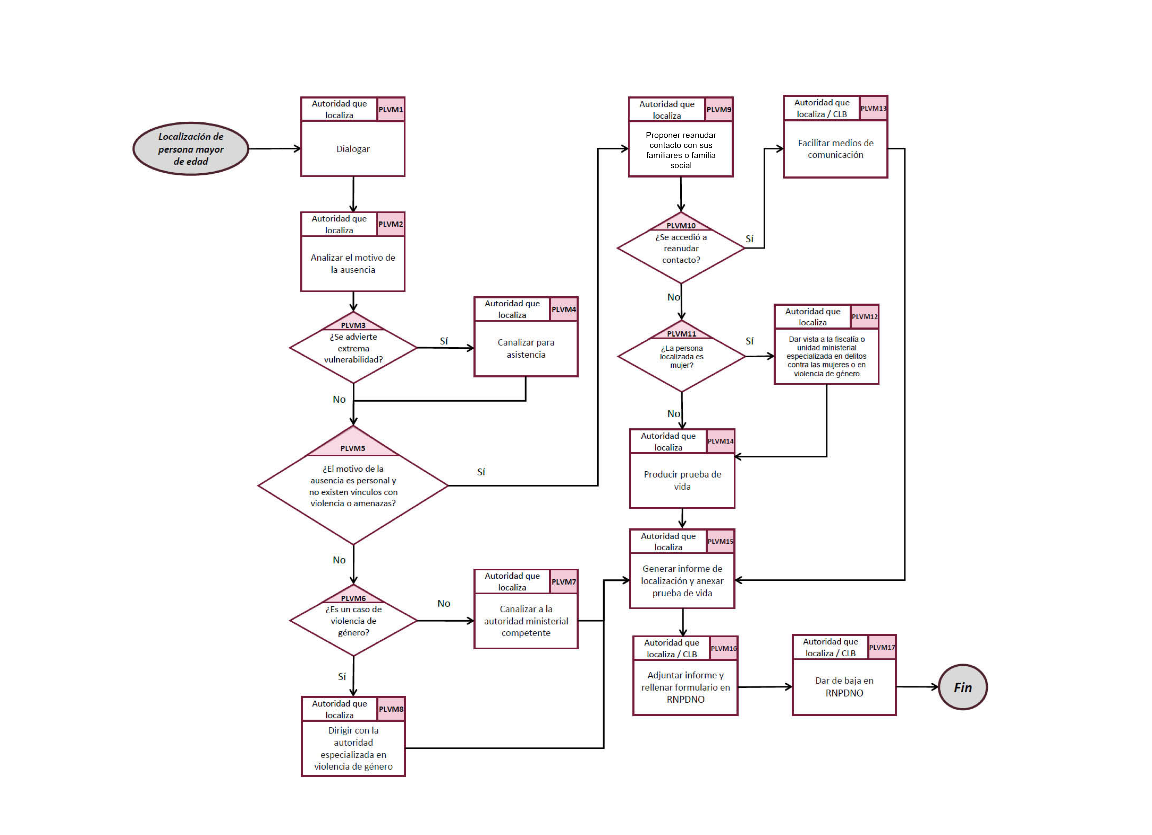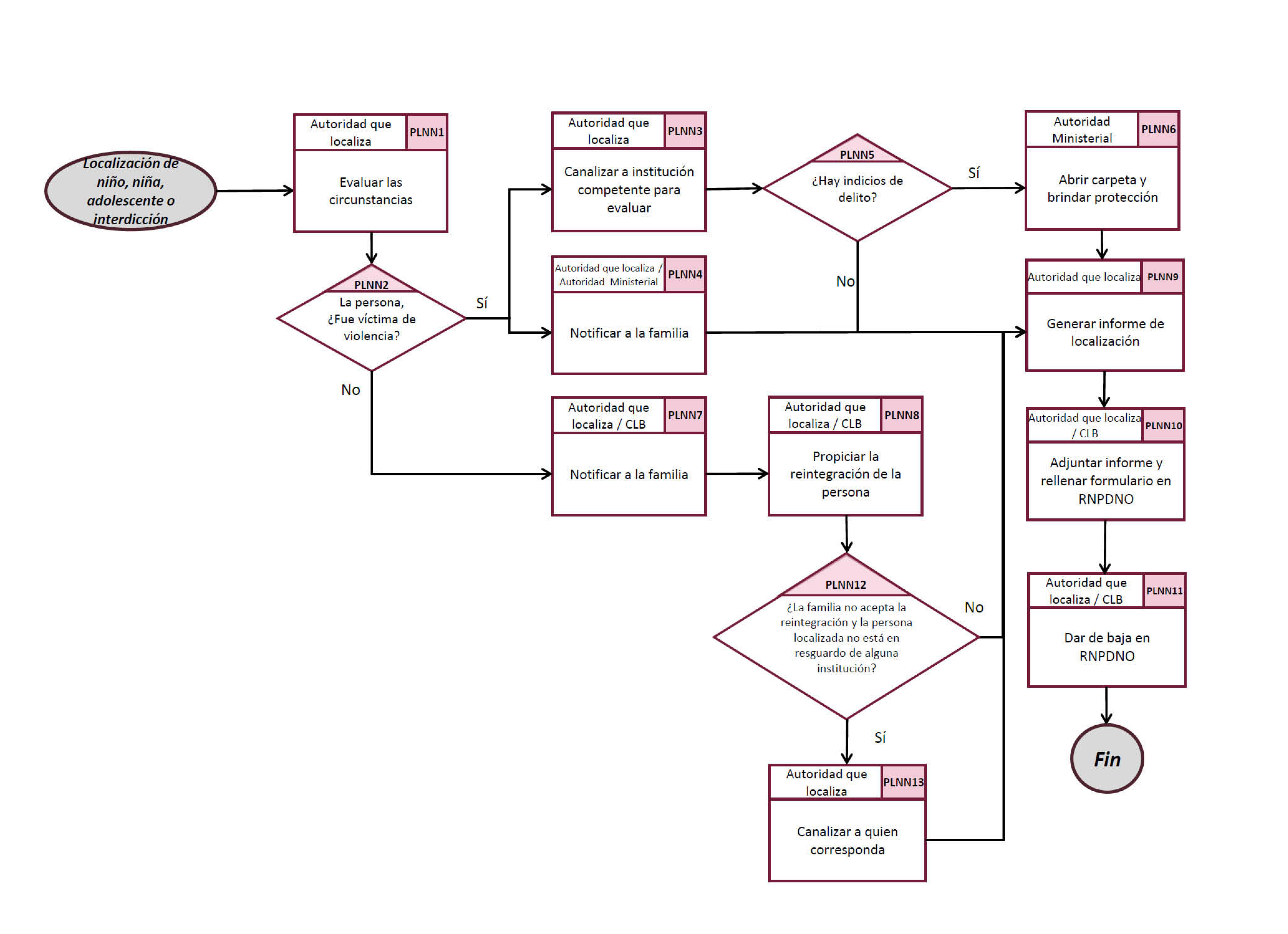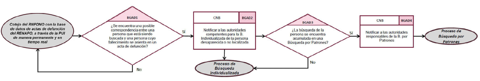 Agotados los análisis de documentación y de campo, se inició con los trabajos de construcción de las bases del protocolo a partir de un modelo de diseño de procesos organizacionales, es decir, del desarrollo de un macroproceso general para la búsqueda de personas, el cual implicó la delimitación de funciones, procesos y relaciones formales con el propósito de definir etapas.