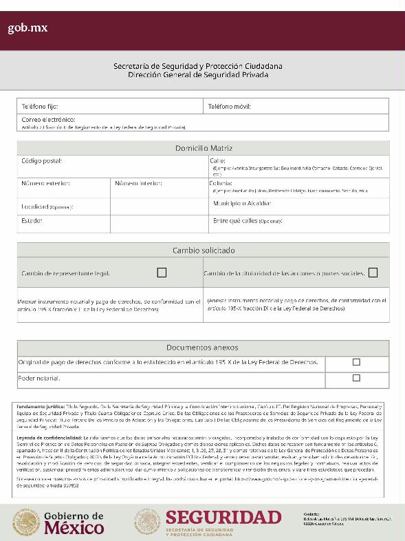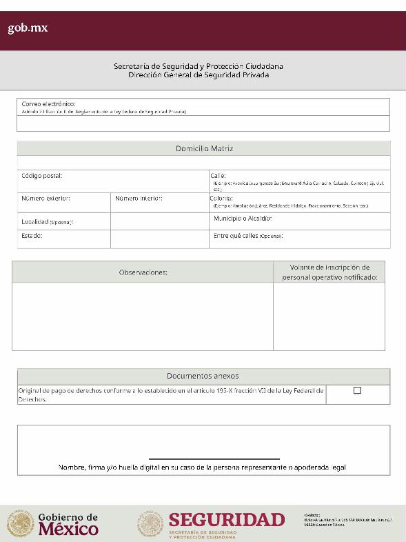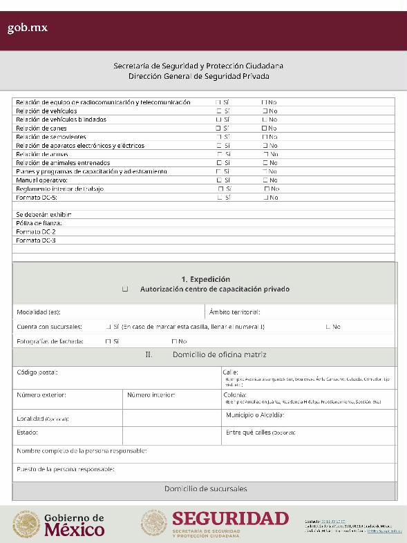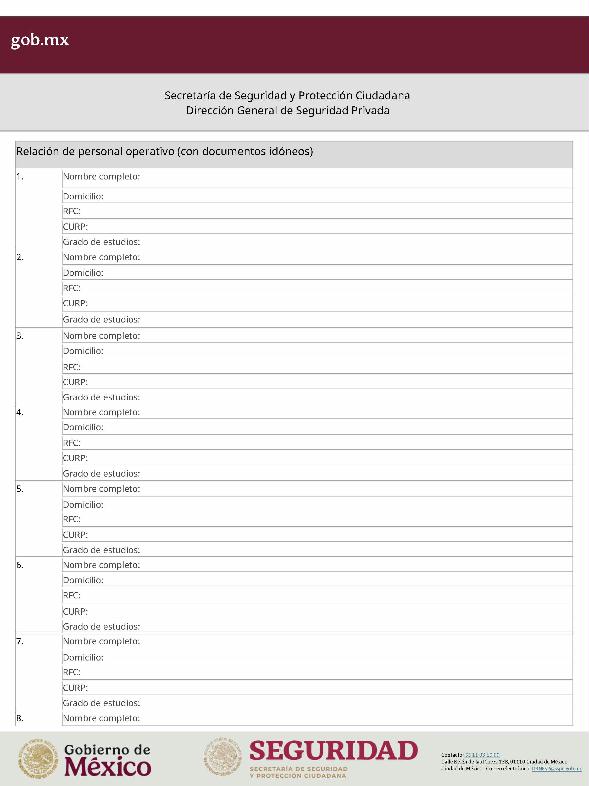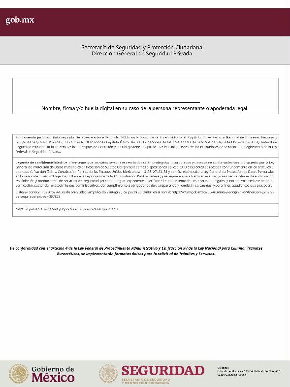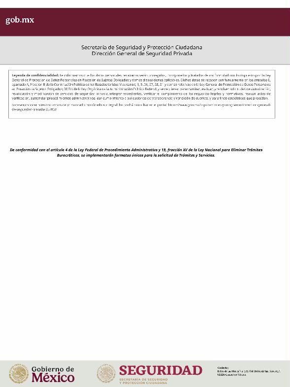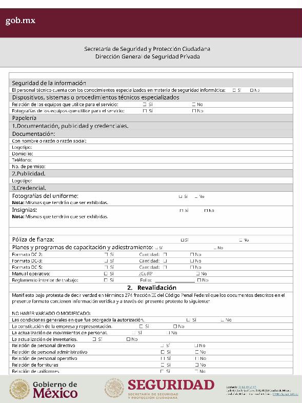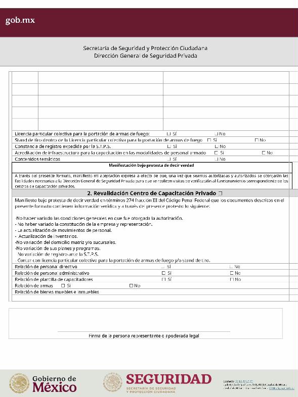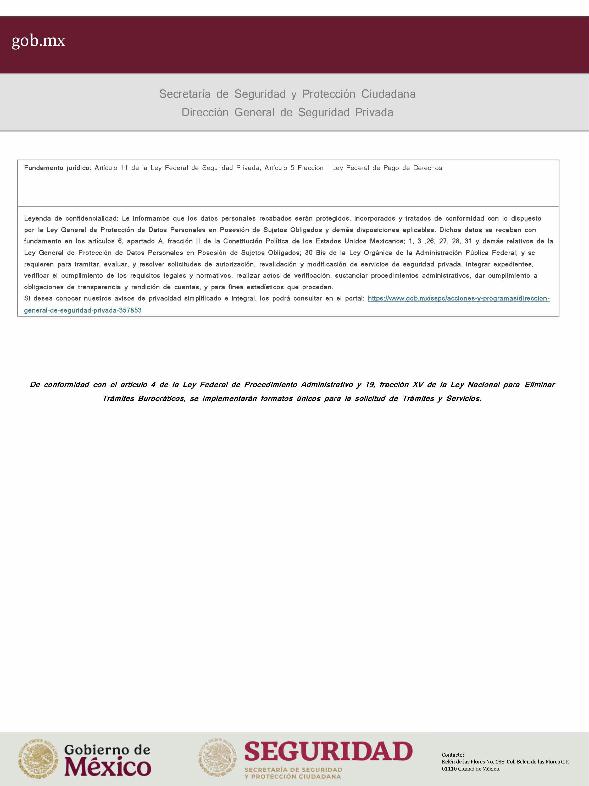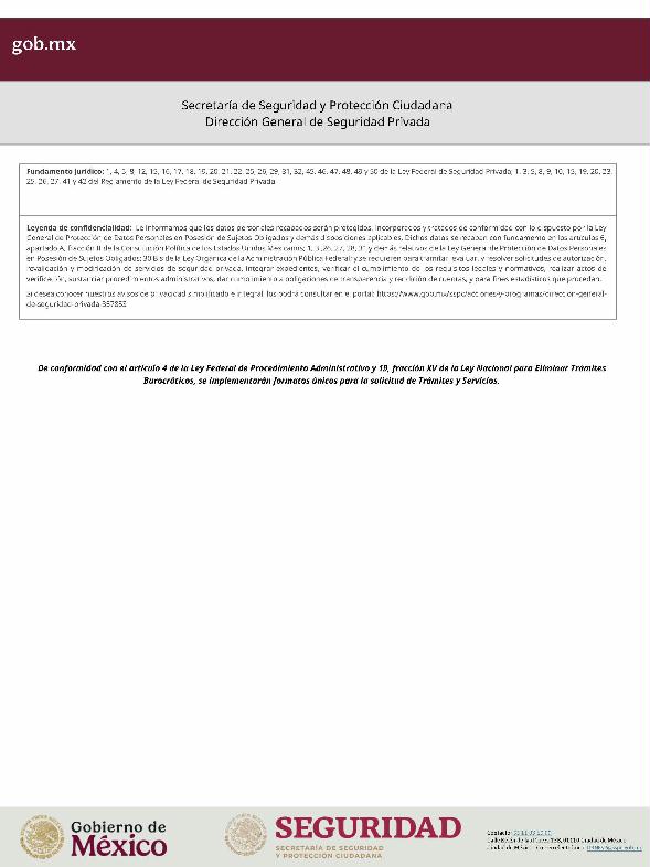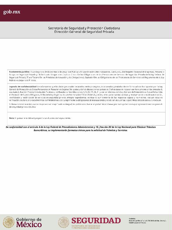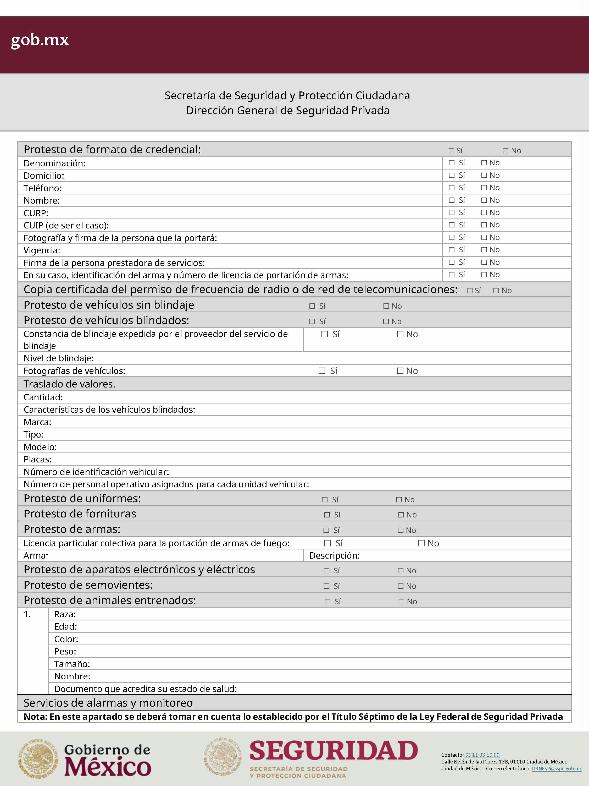 | 1 | SSPC-2019-268-005-B | Expedición de la autorización o revalidación para prestar servicios de seguridad privada en dos o más entidades federativas | 1. Se fusionan los trámites: SSPC-2019-268-005-A; (II ESTUDIO) SSPC-2019-268-005-B; (EXPEDICIÓN) SSPC-2019-268-005-C; (I ESTUDIO) SSPC-2019-268-005-D; (III ESTUDIO) SSPC-2019-268-005-E; (IV ESTUDIO) SSPC-2021-268-002-A; (VI ESTUDIO) SSPC-2021-268-003-A; (V Y VII ESTUDIO) SSPC-2021-268-004-A; y SSPC-2019-268-009-A; (MODIFICACION) 2. Se actualiza la denominación del trámite: "Trámite de autorización, revalidación y modificación de la autorización para prestar servicios de seguridad privada que realizan los particulares en dos o más entidades federativas". 3. Se unifica homoclave del trámite: SSPC-2019-268-005 4. Se implementa formato: "Trámite de autorización, revalidación y modificación de la autorización para prestar servicios de seguridad privada que realizan los particulares en dos o más entidades federativas". 5. Se implementa al formato de solicitud: 1. La aceptación expresa a efecto de que, una vez que sean autorizados los Centros de Capacitación Privados, se otorguen las facilidades necesarias a la Dirección General para realizar visitas de verificación a su funcionamiento. 2. Protesto de sucursales. 3. Protesto de personal técnico/operativo. 4. Protesto de bienes inmuebles. 5. Protesto de equipo de radio y telecomunicaciones. 6. Protesto de armamento. Protesto de vehículos. 7. Protesto de vehículos blindados. 8. Protesto de semovientes y animales entrenados. 9. Protesto de canes. 10. Protesto de medios. 11. Protesto de aparatos eléctricos y electrónicos. 12. Protesto de capacitador interno. 13. Protesto de capacitador externo. 14. Protesto de no contar con personal y equipo. 15. Protesto de sucursales. 16. Protesto de bienes inmuebles. 17. Protesto de vehículos. 18. Protesto de vehículos blindados. 19. Protesto de semovientes y animales entrenados. 20. Protesto formato de credencial. 21. Protesto de uniformes. 22. Protesto de fornituras. 23. Protesto de armas. | 1. Formato de solicitud. 2. Comprobantes de pago de derechos por los siguientes conceptos: a) Por el estudio y trámite de la solicitud para la autorización, revalidación o modificación. b) Por la expedición de la autorización o la revalidación o la modificación. c) Por la inscripción del equipo utilizado en la prestación de los servicios. d) Por la inscripción del personal en el Registro Nacional del Personal de Seguridad Pública. e) Por la consulta de antecedentes policiales del personal operativo. f) Para fungir como centro de capacitación privado (en su caso). 3. Acta constitutiva y/o poder notarial de quien suscribe la solicitud. 4. Cédula Registro Federal de Contribuyentes 5. Acta de nacimiento. 6. Comprobante de domicilio no mayor a tres meses. 7. Fotografías de: a) Fachada: Oficina matriz; rótulo legible de oficina matriz; sucursales; rótulo legible de sucursales. Así como de la fachada y colindancias del centro de capacitación privado, en su caso. b) Uniforme: Cuatro vistas de cuerpo completo, frente, espalda, lateral izquierdo y lateral derecho. c) Vehículos: Costados; frente; parte posterior; toldo; logotipos y emblemas; rótulo con la denominación del prestador de servicios; defensas, torretas. d) Equipos que utilice para el servicio, en el caso de los dispositivos, sistemas o procedimientos técnicos especializados. e) Placa, la cual deberá colocarse en un lugar visible y de acceso al público en el inmueble. (únicamente aplicaría para el supuesto de Servicios de alarmas y monitoreo). f) Sala de capacitación, en caso de contar con capacitador interno y/o de la infraestructura para poder usar armamento. 8. Inventarios y relaciones de: a) Medios humanos, de formación, técnicos, financieros y materiales. b) Uniformes. C) Semovientes y animales entrenados. d) Bienes muebles. e) Bienes inmuebles. f) Equipo de radio y telecomunicaciones. g) Armas. h) Vehículos blindados y sin blindaje. i) Canes. j) Fornituras. k) Aparatos eléctricos y electrónicos. l) Personal directivo, administrativo y operativo. m) Línea telefónica. 9. Currículum vitae de personal directivo (que incluya datos personales, escolaridad, experiencia laboral y firma autógrafa). 10. Muestras físicas: a) Insignias b) Divisas c) Logotipo e) Emblema. f) Credencial. 11. Formatos emitidos por la Secretaría de Trabajo y Previsión Social: a) DC-2 (Planes y programas de capacitación y adiestramiento vigentes. b) DC-3 (Constancias de competencias o de habilidades laborales del personal operativo. c) DC-5 (Constancias de capacitación, diplomas, certificados de los capacitadores) 12. Manuales o instructivos operativos. 13. Reglamento interior de trabajo. 14. Registro sanitario de los dispositivos de identificación personal. 15. Póliza de fianza (en caso de ser procedente la autorización o revalidación). 16. Documento que acredite la legal posesión del bien inmueble. En caso de vehículos blindados, se solicitará, además: 17. Constancia de blindaje en el caso de contar con vehículos blindados, emitida por el proveedor del servicio de blindaje con la que acredite el nivel. En caso de operar frecuencias de radio o red de telecomunicaciones, se solicitará, además: 17. Permiso para operar frecuencia de radio o red de telecomunicaciones, emitida por la concesionaria que da el servicio de radiofrecuencia, o contrato con concesionaria autorizada. En caso de portación de armas de fuego, se solicitará, además: 17. Licencia de portación de armas, expedido por la SEDENA. En caso de contar con canes, se solicitará, además: 17. Documento que acredite los conocimientos en adiestramiento animal, en caso de contar con caninos y/o otros animales para la prestación de servicios, expedido por persona especializada. En caso de la modalidad de Seguridad de la Información, se solicitará, además: 17. Diploma, certificado o constancia que acredite 