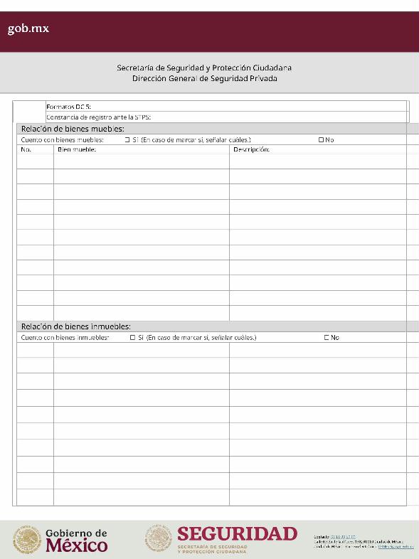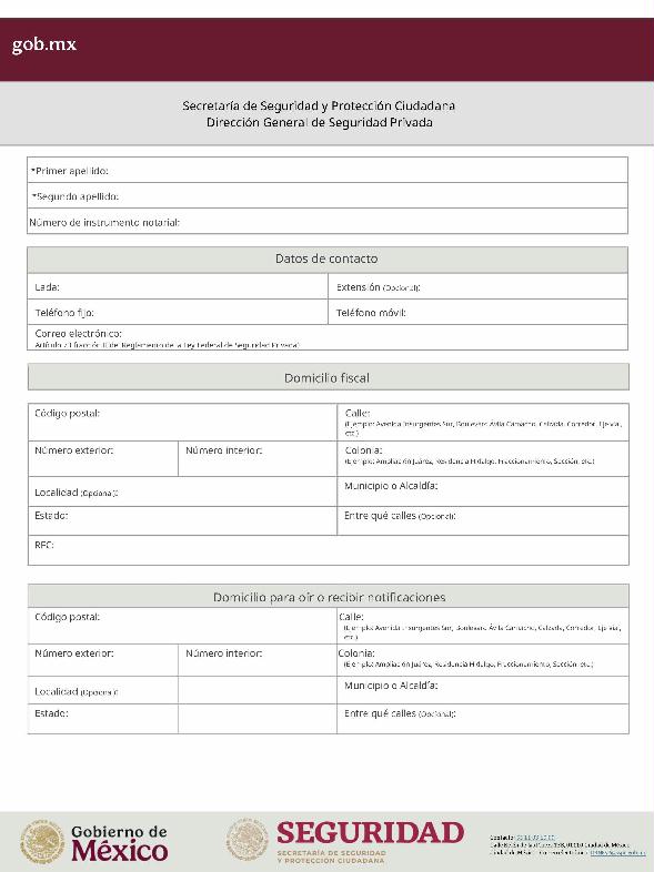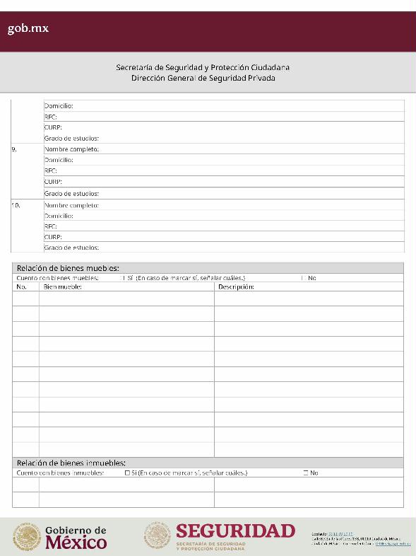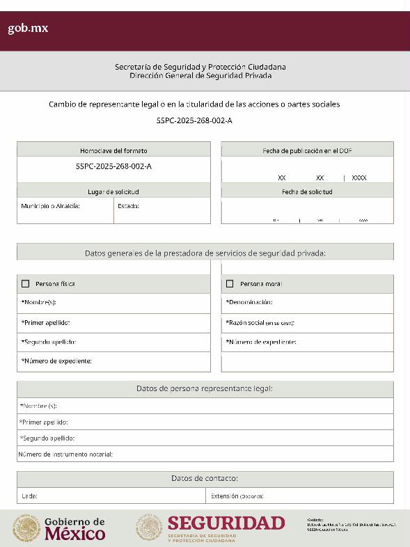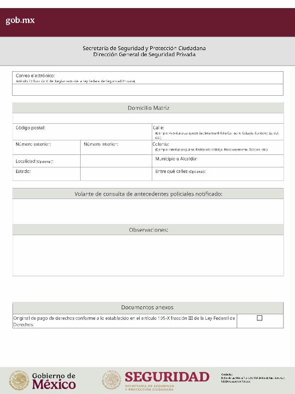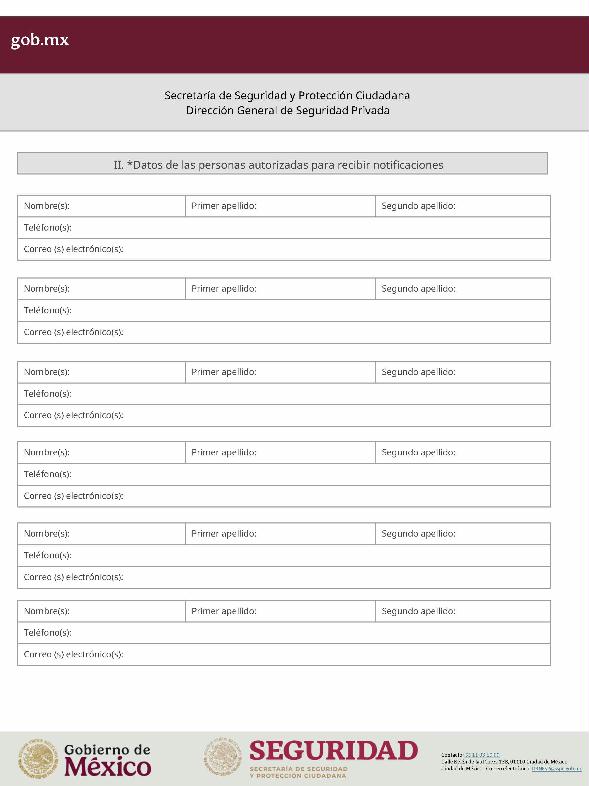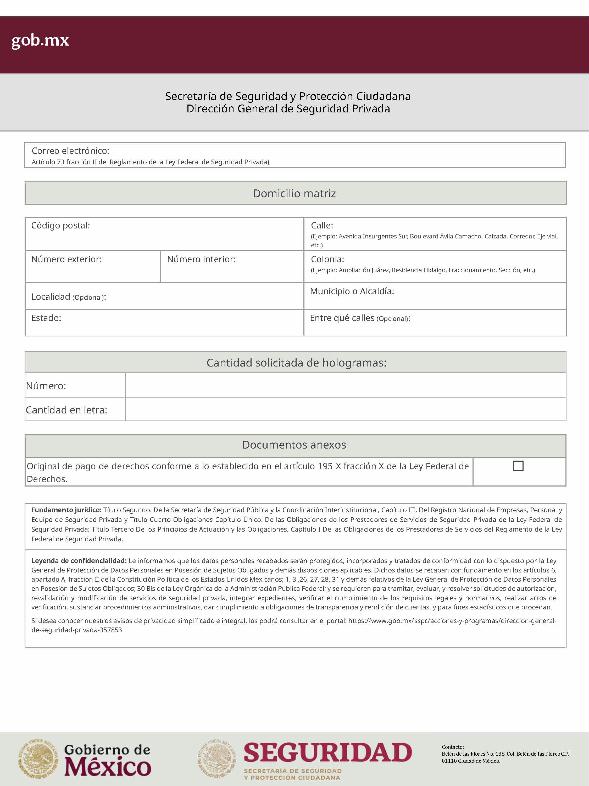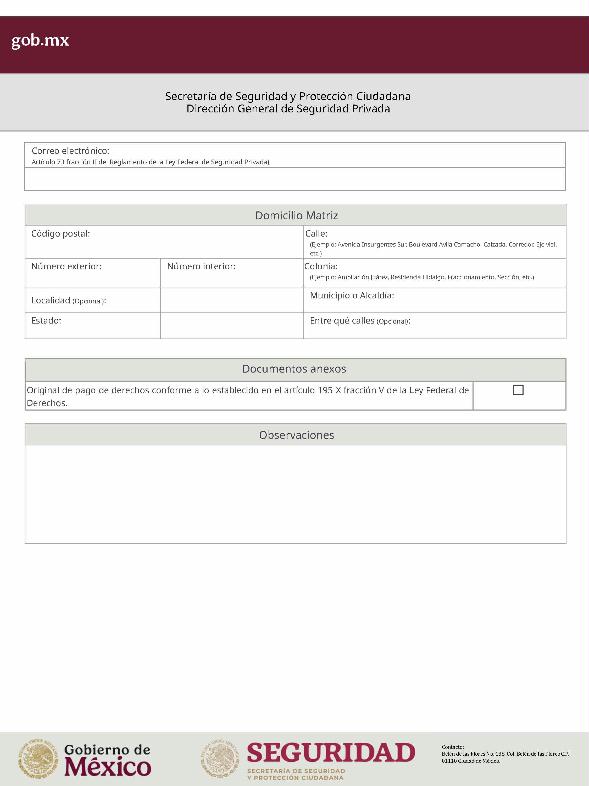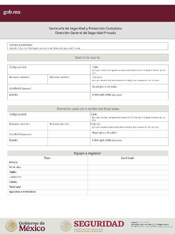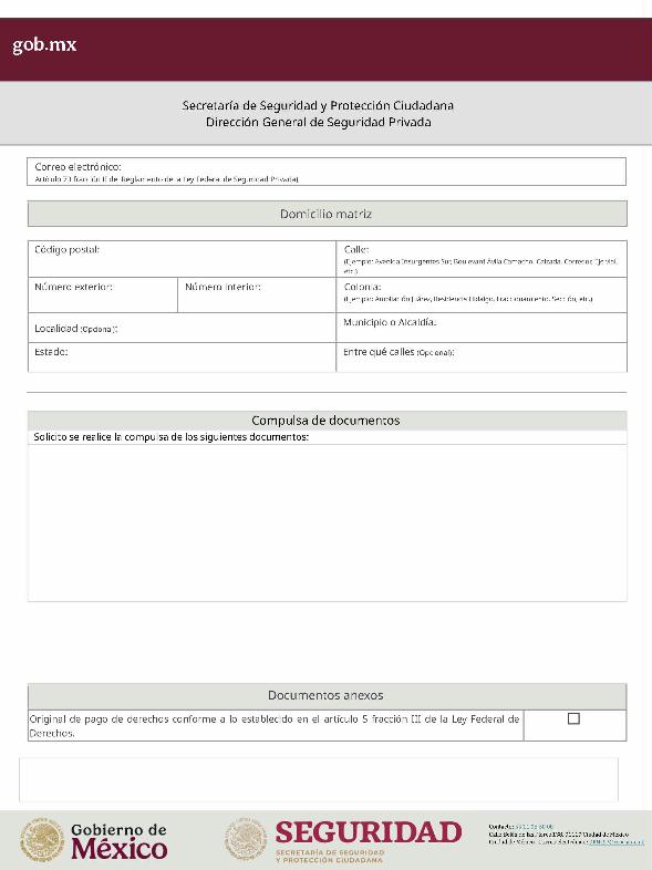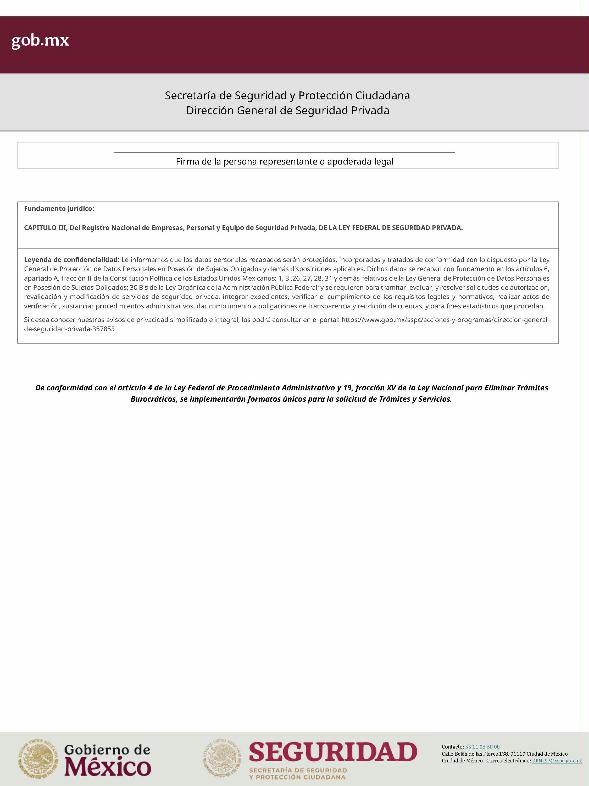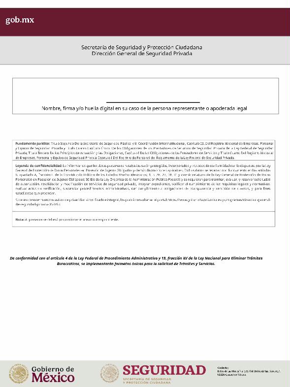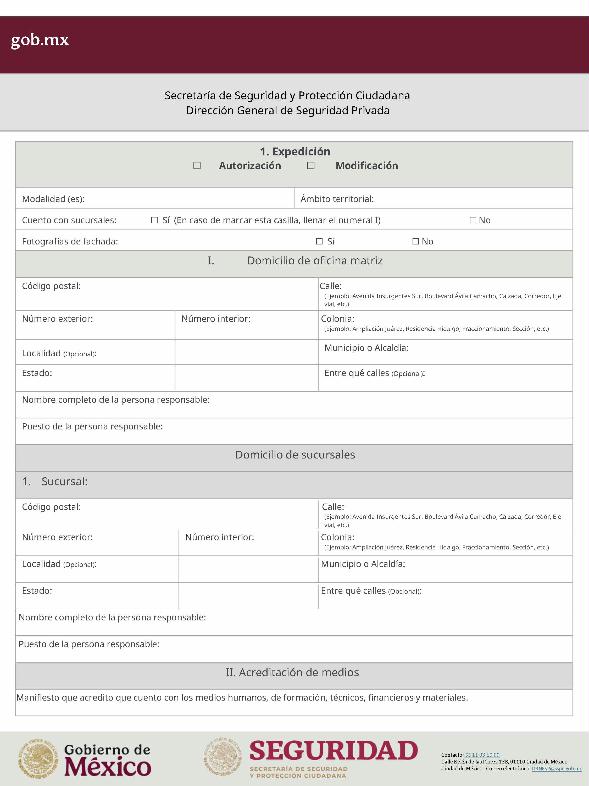 | 1 | SSPC-2019-268-005-B | Expedición de la autorización o revalidación para prestar servicios de seguridad privada en dos o más entidades federativas | 1. Se fusionan los trámites: SSPC-2019-268-005-A; (II ESTUDIO) SSPC-2019-268-005-B; (EXPEDICIÓN) SSPC-2019-268-005-C; (I ESTUDIO) SSPC-2019-268-005-D; (III ESTUDIO) SSPC-2019-268-005-E; (IV ESTUDIO) SSPC-2021-268-002-A; (VI ESTUDIO) SSPC-2021-268-003-A; (V Y VII ESTUDIO) SSPC-2021-268-004-A; y SSPC-2019-268-009-A; (MODIFICACION) 2. Se actualiza la denominación del trámite: "Trámite de autorización, revalidación y modificación de la autorización para prestar servicios de seguridad privada que realizan los particulares en dos o más entidades federativas". 3. Se unifica homoclave del trámite: SSPC-2019-268-005 4. Se implementa formato: "Trámite de autorización, revalidación y modificación de la autorización para prestar servicios de seguridad privada que realizan los particulares en dos o más entidades federativas". 5. Se implementa al formato de solicitud: 1. La aceptación expresa a efecto de que, una vez que sean autorizados los Centros de Capacitación Privados, se otorguen las facilidades necesarias a la Dirección General para realizar visitas de verificación a su funcionamiento. 2. Protesto de sucursales. 3. Protesto de personal técnico/operativo. 4. Protesto de bienes inmuebles. 5. Protesto de equipo de radio y telecomunicaciones. 6. Protesto de armamento. Protesto de vehículos. 7. Protesto de vehículos blindados. 8. Protesto de semovientes y animales entrenados. 9. Protesto de canes. 10. Protesto de medios. 11. Protesto de aparatos eléctricos y electrónicos. 12. Protesto de capacitador interno. 13. Protesto de capacitador externo. 14. Protesto de no contar con personal y equipo. 15. Protesto de sucursales. 16. Protesto de bienes inmuebles. 17. Protesto de vehículos. 18. Protesto de vehículos blindados. 19. Protesto de semovientes y animales entrenados. 20. Protesto formato de credencial. 21. Protesto de uniformes. 22. Protesto de fornituras. 23. Protesto de armas. | 1. Formato de solicitud. 2. Comprobantes de pago de derechos por los siguientes conceptos: a) Por el estudio y trámite de la solicitud para la autorización, revalidación o modificación. b) Por la expedición de la autorización o la revalidación o la modificación. c) Por la inscripción del equipo utilizado en la prestación de los servicios. d) Por la inscripción del personal en el Registro Nacional del Personal de Seguridad Pública. e) Por la consulta de antecedentes policiales del personal operativo. f) Para fungir como centro de capacitación privado (en su caso). 3. Acta constitutiva y/o poder notarial de quien suscribe la solicitud. 4. Cédula Registro Federal de Contribuyentes 5. Acta de nacimiento. 6. Comprobante de domicilio no mayor a tres meses. 7. Fotografías de: a) Fachada: Oficina matriz; rótulo legible de oficina matriz; sucursales; rótulo legible de sucursales. Así como de la fachada y colindancias del centro de capacitación privado, en su caso. b) Uniforme: Cuatro vistas de cuerpo completo, frente, espalda, lateral izquierdo y lateral derecho. c) Vehículos: Costados; frente; parte posterior; toldo; logotipos y emblemas; rótulo con la denominación del prestador de servicios; defensas, torretas. d) Equipos que utilice para el servicio, en el caso de los dispositivos, sistemas o procedimientos técnicos especializados. e) Placa, la cual deberá colocarse en un lugar visible y de acceso al público en el inmueble. (únicamente aplicaría para el supuesto de Servicios de alarmas y monitoreo). f) Sala de capacitación, en caso de contar con capacitador interno y/o de la infraestructura para poder usar armamento. 8. Inventarios y relaciones de: a) Medios humanos, de formación, técnicos, financieros y materiales. b) Uniformes. C) Semovientes y animales entrenados. d) Bienes muebles. e) Bienes inmuebles. f) Equipo de radio y telecomunicaciones. g) Armas. h) Vehículos blindados y sin blindaje. i) Canes. j) Fornituras. k) Aparatos eléctricos y electrónicos. l) Personal directivo, administrativo y operativo. m) Línea telefónica. 9. Currículum vitae de personal directivo (que incluya datos personales, escolaridad, experiencia laboral y firma autógrafa). 10. Muestras físicas: a) Insignias b) Divisas c) Logotipo e) Emblema. f) Credencial. 11. Formatos emitidos por la Secretaría de Trabajo y Previsión Social: a) DC-2 (Planes y programas de capacitación y adiestramiento vigentes. b) DC-3 (Constancias de competencias o de habilidades laborales del personal operativo. c) DC-5 (Constancias de capacitación, diplomas, certificados de los capacitadores) 12. Manuales o instructivos operativos. 13. Reglamento interior de trabajo. 14. Registro sanitario de los dispositivos de identificación personal. 15. Póliza de fianza (en caso de ser procedente la autorización o revalidación). 16. Documento que acredite la legal posesión del bien inmueble. En caso de vehículos blindados, se solicitará, además: 17. Constancia de blindaje en el caso de contar con vehículos blindados, emitida por el proveedor del servicio de blindaje con la que acredite el nivel. En caso de operar frecuencias de radio o red de telecomunicaciones, se solicitará, además: 17. Permiso para operar frecuencia de radio o red de telecomunicaciones, emitida por la concesionaria que da el servicio de radiofrecuencia, o contrato con concesionaria autorizada. En caso de portación de armas de fuego, se solicitará, además: 17. Licencia de portación de armas, expedido por la SEDENA. En caso de contar con canes, se solicitará, además: 17. Documento que acredite los conocimientos en adiestramiento animal, en caso de contar con caninos y/o otros animales para la prestación de servicios, expedido por persona especializada. En caso de la modalidad de Seguridad de la Información, se solicitará, además: 17. Diploma, certificado o constancia que acredite 