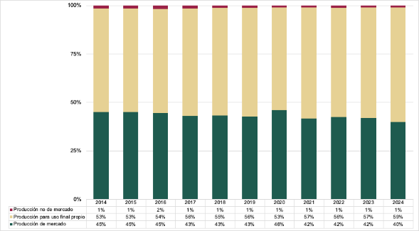 Gráfico 2. Cuenta de producción de la vivienda, por tipo de producción y sector institucional en México de 2014 a 2024 (valores constantes a precios de 2018 sin alquiler imputado)