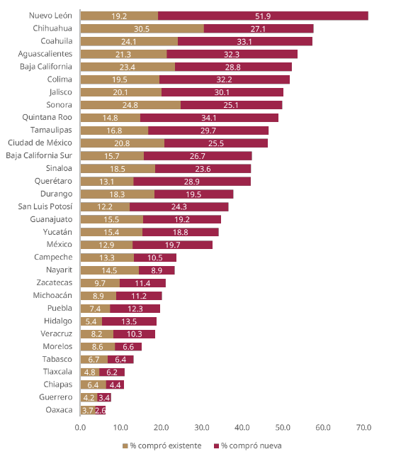 Gráfico 3. Porcentaje de viviendas que fueron adquiridas hechas respecto al parque habitacional, por tipo de vivienda y entidad federativa 2024