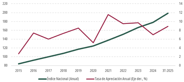 Fuente: SEDATU, con datos de la SHF. Datos Abiertos del Índice SHF de Precios de la Vivienda (2025). Disponible en: https://transparencia.shf.gob.mx/sitepages/IndicePV.aspx